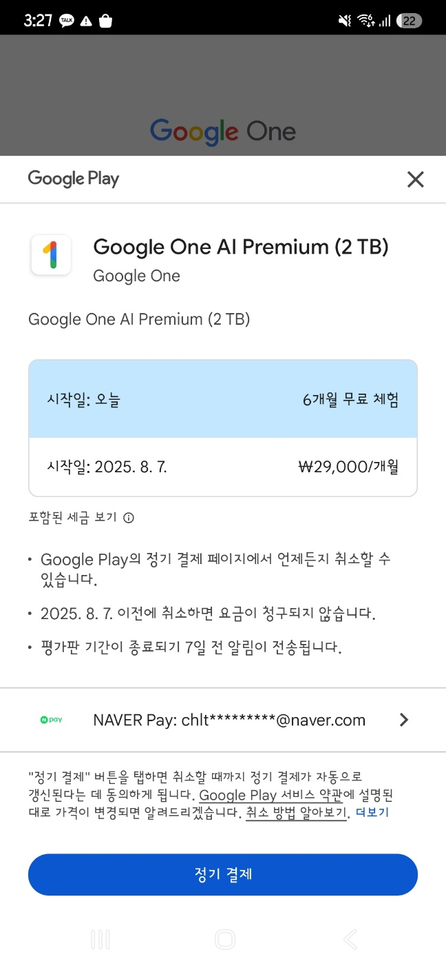 - 결제 정보를 입력(무료 기간 종료 후 자동 결제됨)