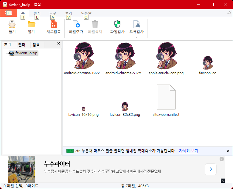 - 생성된 파비콘 파일은 압축 파일 형태로 다운로드 받을 수 있으며, 압축을 해제하면 다양한 크기의 파비콘 파일을 확인할 수 있습니다.