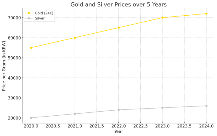 최근 몇 년간 금값은 꾸준히 상승세를 보여왔습니다. 5년 전인 2020년 초, 24K 금 시세는 1g당 약 50,000원에서 55,000원 사이였으며, 현재 시세는 약 70,000원으로, 금값이 약 30% 이상 상승한 셈입니다. 이는 글로벌 경제 불안정, 통화 완화 정책, 인플레이션 우려 등으로 금에 대한 수요가 증가했기 때문입니다.